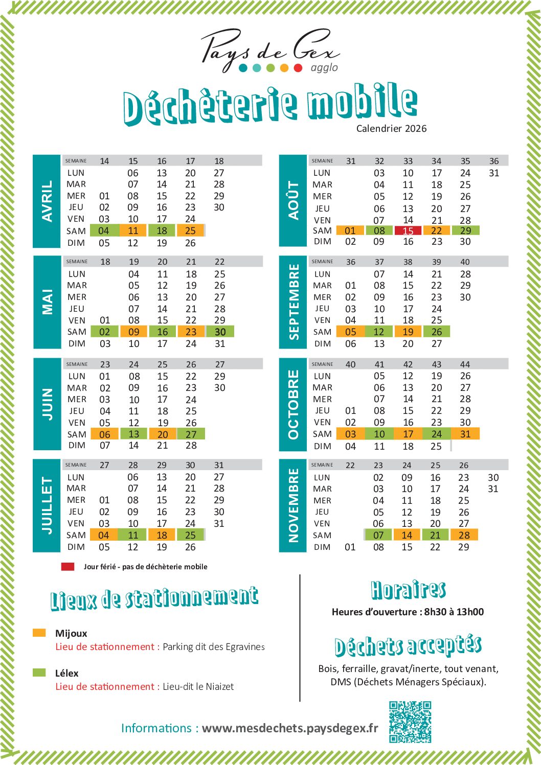 Les déchets acceptés sont : Bois, ferraille, gravât / inerte, tout venant, DMS (déchets ménagers spéciaux)